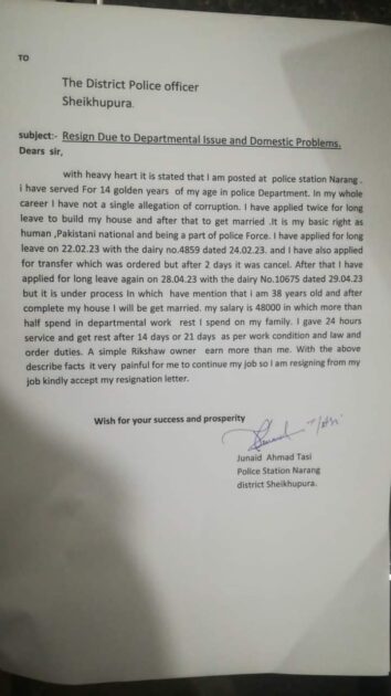 Sheikhupura: ASI Javed Ahmed of Punjab Police has submitted his resignation due to severe inflation and low salary. Javed Ahmed, ASI of Punjab Police, wrote that I have served the police department with honesty for 14 years. My half salary is consumed by the job. I have turned 38 and haven’t been able to build my own house or get married. A rickshaw driver earns more than me. In these circumstances, I am resigning. Former Chief Minister of Punjab, Parvez Elahi, and other rulers have made false promises to increase the salaries of junior ranks in the police, which has resulted in severe financial distress for the police. 😔
